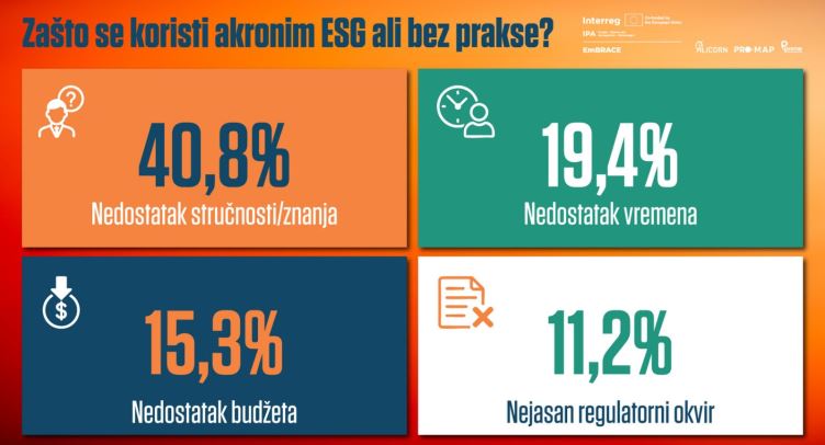 Kao što istraživanje otkriva, više od polovine firmi nema ni osnovnu ESG strategiju, dok čak 77,6% njih još nema zakonsku obavezu izvještavanja. U praksi, ESG se svodi na upotrebu poznate skraćenice u korporativnim izvještajima i promocijama, bez stvarnog, materijalnog ulaganja u procese, interne politike ili edukaciju zaposlenih. „Mnoge kompanije nemaju dovoljno znanja o ESG-u i njegovim koristima,“ ističe jedna od ekspertica koja je učestvovala u kvalitativnom dijelu istraživanja. “Ovaj nedostatak znanja ne sprečava upotrebu ESG-a u promotivnim materijalima, ali predstavlja ozbiljnu prepreku za njegovo uvođenje u svakodnevnu poslovnu praksu.”