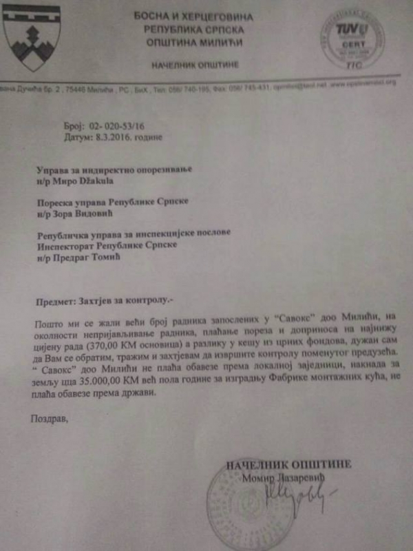 opštine Momir Lazarević uputio Zahtjev za kontrolu firme Savoks Upravi za