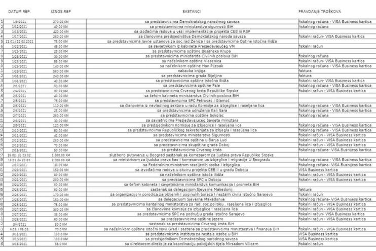Njegov sastanak s izvođačima radova u vezi s implementacijom projekta CEB Iii RSP od 13. januara građane BiH koštao je 420 KM. Ministar je široke ruke bio i 29. januara, kada je 140 KM potrošio na sastanku s načelnikom Han Pijeska, a tog istog dana 560 maraka potrošeno je na "nabavku knjiga". Kakvih, nije navedeno. Dva dana poslije ministar je sastančio i s predstavnicima grada Bijeljine i tada je potrošio 240 KM.