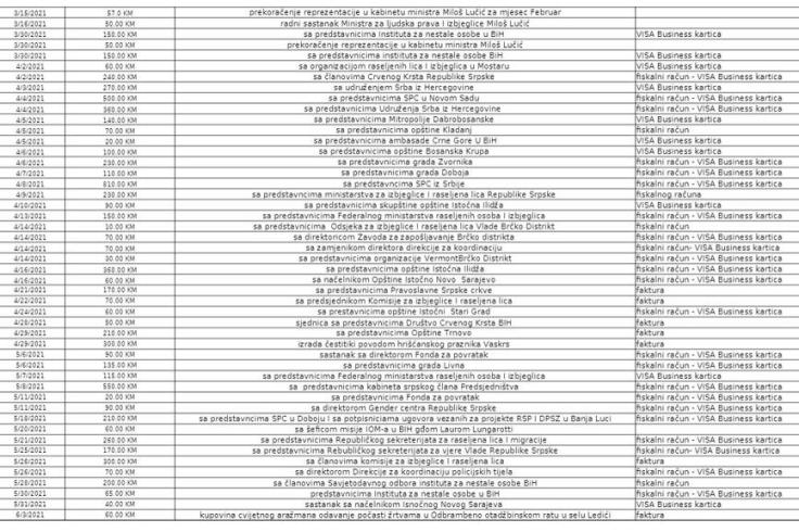 Lučić je tokom ovog mjeseca imao sastanke sa članovima Komisije za izbjeglice i raseljene osobe, kada je potrošeno 300 KM, organizacijom porodica zarobljenih i poginulih boraca i nestalih civila Istočno Sarajevo (170 KM), članovima iz nevladinog sektora u radu Komisije za izbjeglice i raseljene osobe (110 KM)… Ministar Lučić je sredinom februara išao u Beograd, a njegovi sastanci s komesarom za ljudska prava Republike Srpske te ministricom za ljudska prava, kao i komesarom za izbjeglice i migracije poreske obveznike koštali su ravno 3.000 maraka.