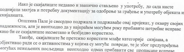 „Skijalište će pretežno koristiti mlađa kategorija skijaša, a objektivno radi se o aktivnostima u kojima su moguće povrede, te je zbog toga predupređenje mogućih željenih posljedica neophodno odmah pribaviti sve propisane isprave“, navodi se u dopisu koje potpisuje načelnik opštine Pale Miograd Kovačević.