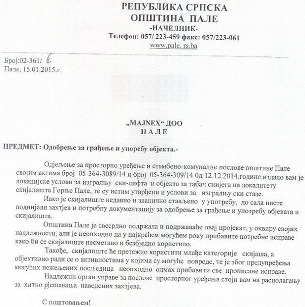 U posjedu portala CAPITAL je dopis opštine Pale u kojoj „Majneks“ upozoravaju da su otvorili Skijalište bez građevinske i upotrebne dozvole.