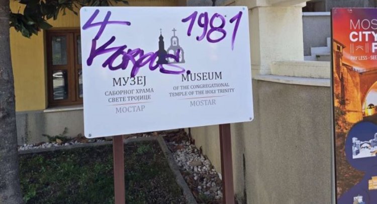Mostar: Grafiti na tabli ispred Vladičanskog dvora gdje su smještene srpske institucije