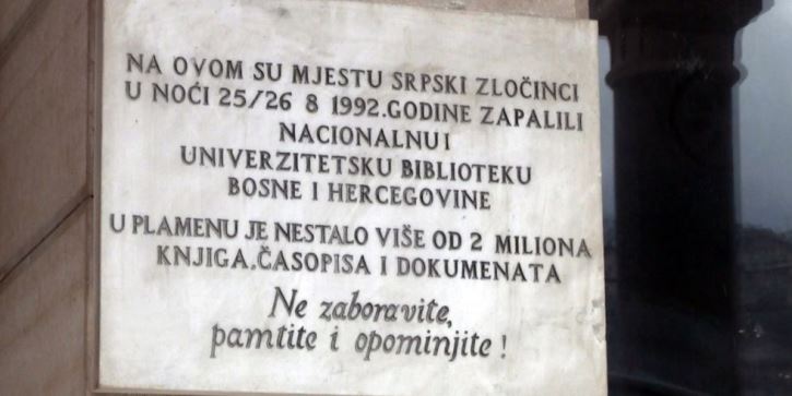 “Najpoznatija” spomen-ploča u Sarajevu, oko koje je bilo sporenja i za koju je gradonačelnica Karić rekla da natpis na njoj neće biti promijenjen za vrijeme gradske administracije na čijem je čelu, jeste ona na gradskoj Vijećnici. Na njoj je također istaknuto da su tada Nacionalnu i univerzitetsku biblioteku zapalili srpski zločinci.