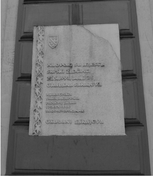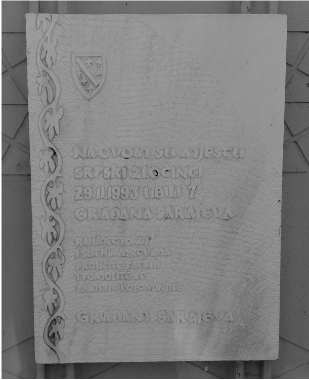 U publikaciji In Memoriam Centar Sarajevo (1992 – 1995), koju je objavilo Udruženje za društvena istraživanja i komunikacije 2016. godine, te u fotogaleriji Radija Slobodna Evropa, možemo vidjeti neke primjere onoga što piše na sarajevskim memorijalima i spomen-pločama stradalim civilima tokom opsade grada 1992 – 1995.