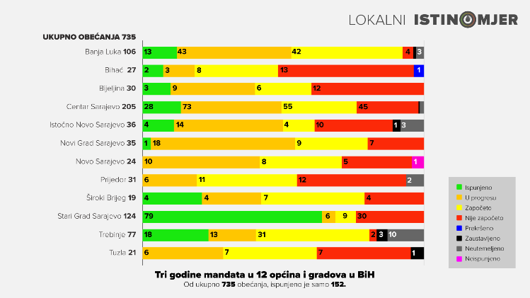 Od ukupno 735 obećanja koja su dali načelnici i gradonačelnici 12 jedinica lokalne samouprave u BiH, a čije ispunjavanje prati Istinomjer, nakon tri godine u potpunosti je ispunjeno njih 152, dok gotovo polovina (49%) datih obećanja ima veliku šansu da budu ispunjena do kraja mandata u oktobru 2020. godine. Osim toga, 197 obećanja ili njih 26%, nalazi se u kategoriji srednje vjerovatnoće ispunjenosti, dok 181 obećanje (25%) ima nisku vjerovatnoću da će biti ispunjeno do kraja mandata.