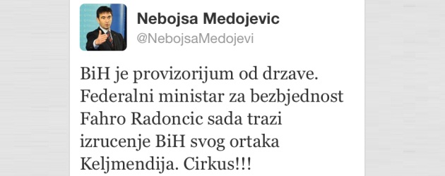"BiH je provizorijum od države. Federalni ministar za bezbjednost Fahro Radončić sada traži izručenje BiH svog ortaka Keljmendija. Cirkus!!!", napisao je Medojević.
