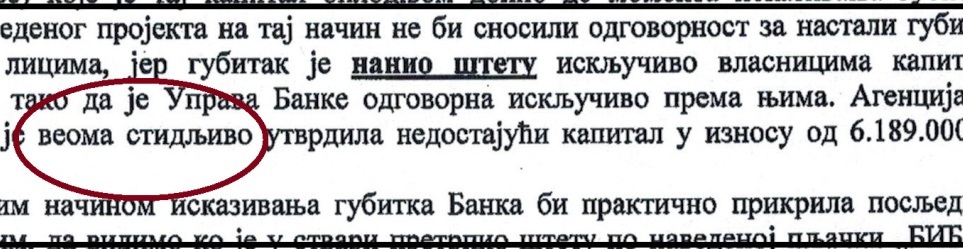 Međutim, postavlja se pitanje kako je nastao gubitak koji je prikazala banka i koji je dvostruko niži od utvrđenog. „Pošto je Banka sa stoodstotnim pravom glasa u vlasništvu strane firme, uz 5 miliona kapitala fondova u državnom vlasništvu RS bez prava glasa, gubitak je mogao biti maksimalno iskazan do visine kapitala nerezidenta i rezervi.