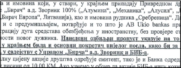 Navedenim načinom iskazivanja gubitka BIB bi praktično prikrila posljedice pljačke, dok je Agencija za bankarstvo RS veoma stidljivo utvrdila nedostajući kapital od 6,2 miliona KM. Kapital vlasnika BIB-a (Ukio Bankas i UBIG) prodan je krajem 2010. i početkom 2011. godine kompaniji UAB „Balkan Investu“ i to po cijeni koja je bila tri puta veća od cijene emitovanih akcija. Kredit za ovaj posao odobrila je Ukio Banka, a naplata kredita obezbijeđena je kompletnom imovinom Fabrike glinice „Birač“ i „Rudnika Srebrenica“, navodi se u Izvještaju Deviznog inspektorata.