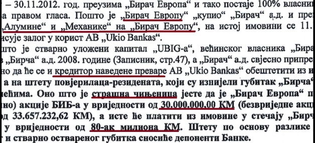 – Pošto je stvarno uloženi kapital većinskog vlasnika „Birača“ UBIG-a izvučen upravo iz „Birača“ 2008. godine i pošto je jasno da je „Birač“ svjesno pripremljen za stečaj, jasno je da će se kreditor navedene prevare, a to je Ukio Bankas, obeštetiti iz imovine u stečaju. Obeštećenje se dešava na štetu povjerilaca-rezidenata, koji su iznijeli gubitak „Birača“ na svojim plećima. Strašna činjenica je i da je „Birač Evropa“ preuzeo akcije BIB-a koje su vrijedile 30 miliona KM (bezvrijedne akcije zbog zvaničnog gubitka od 33,6 miliona KM), a onda će te akcije naplatiti od imovine FG „Birač“ u stečaju u vrijednosti od 80-tak miliona KM. Štetu po osnovu razlike između iskazanog i stvarno ostvarenog gubitka snosiće deponenti Banke – zapisala je u izvještaju direktorica Republičkog deviznog isnpektorata Zorica Cvijanović.