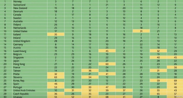Među top 30 se nalaze dvije trećine evropskih zemalja.