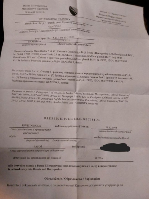 Kako se navodi u obrazloženju, on predstavlja prijetnju bezbjednosti BiH, javnom poretku, javnom redu i miru, javnom zdravlju u BiH ili međunarodnim odnosima BiH.