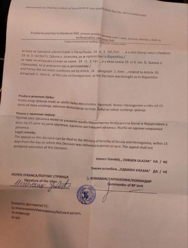Kako se navodi u obrazloženju, on predstavlja prijetnju bezbjednosti BiH, javnom poretku, javnom redu i miru, javnom zdravlju u BiH ili međunarodnim odnosima BiH.