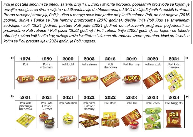 Poli je postala sinonim za pileću salamu broj 1 u Evropi i stvorila porodicu popularnih proizvoda sa kojom je osvojila mnoga srca širom svijeta – od Skandinavije do Mediterana, od SAD do Ujedinjenih Arapskih Emirata. Prema razvojnoj strategiji, Poli je ušao u mnoge nove kategorije: od pilećih salama Poli, do hot dogova (2016 godine), šunke i šunke sa Poli hammy proizvodima (2018 godine), dječija linija Poli Kids sa smanjenim sadržajem soli (2021 godine), paštete Poli pate (2021 godine) do takozvanih programa pogodnosti sa proizvodima Poli rolnice i Poli pizza (2022 godine) i Poli zelena linija (2023 godine), sa kojom se takođe obraćaju svima koji iz bilo kog razloga traže kvalitetne i ukusne alternativne izvore proteina. Novi proizvod sa kojim se Poli predstavlja u 2024 godini je Poli nuggets.