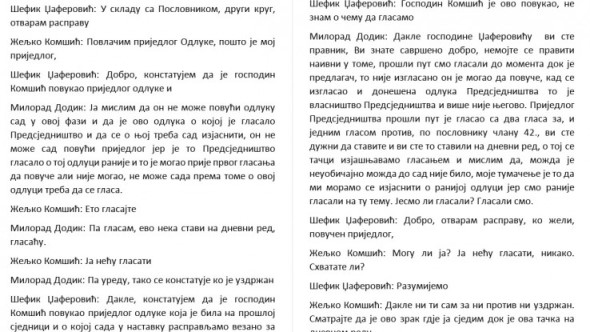 Milorad Dodik: Dakle gospodine DŽaferoviću vi ste pravnik, Vi znate savršeno dobro, nemojte se praviti naivni u tome, prošli put smo glasali do momenta dok je predlagač, to nije izglasano on je mogao da povuče, kad se izglasao i donešena odluka Predsjedništva to je vlasništvo Predsjedništva i više nije njegovo. Prijedlog Predsjedništva prošli put je glasao sa dva glasa za, i jednim glasom protiv, po poslovniku članu 42., vi ste dužni da stavite i vi ste to stavili na dnevni red, o toj se tačci izjašnjavamo glasanjem i mislim da, možda je neuobičajno možda do sad nije bilo, moje tumačenje je to da mi moramo se izjasniti o ranijoj odluci jer smo ranije glasali na tu temu. Jesmo li glasali? Glasali smo.