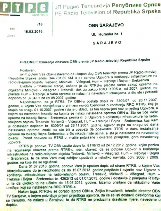 RTRS je polovinom marta ove godine uputila dopis OBN-u, koji je u posjedu CAPITAL-a, a u kojem traži da im OBN u roku od 24 časa plati dug, navodeći da će u suprotnom isključiti njihove uređaje koji se nalaze na radio-relejnom objektu RTRS.