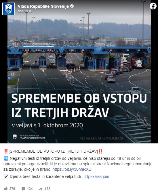 Od 1. oktobra valjanim su proglašeni i testovi koji su urađeni u trećim zemljama, a na veb-stranici Nacionalne laboratorije za zdravlje, zaštitu životne sredine i hranu se nalazi spisak svih laboratorija čiji su testovi priznati u Sloveniji. Iz BiH se na spisku nalaze svih 20 laboratorija koje rade analizu uzoraka na virus korona.