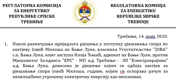 Naime, Regulatorna komisija za energetiku Republike Srpske (RERS) koja je zasijedala 14.05., odbila je njegov zahtjev, što znači da mu je jedino preostalo da račun pokuša da ospori preko suda.