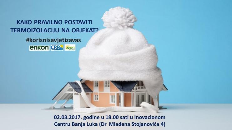 Pravilno postavljena termička izolacija smanjuje toplotne gubitke zimi, pregrijavanje prostora ljeti, te štiti objekat od spoljnjih uticaja temperaturnih razlika, a predavanje o osnovnim pravilima postavljanja termičke izolacije održaće dipl. ing. građevinarstva Ervin Đember i bacc. ing. građevinarstva Jelena Šimić.