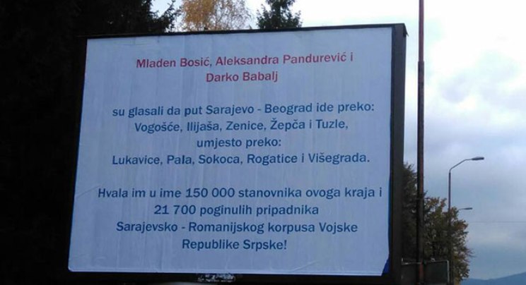 Policija u Istočnom Sarajevo izašla je na mjesta gdje su postavljeni bilbordi, koji su osvanuli jutros na ulicima Pala i Istočnog Novog Sarajeva, a na kojima su prozvani poslanici i delegat SDS-a u parlamentu BiH Mladen Bosić, Aleksandra Pandurević i Darko Babalj.