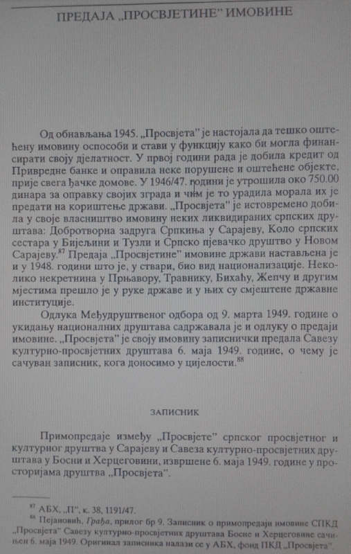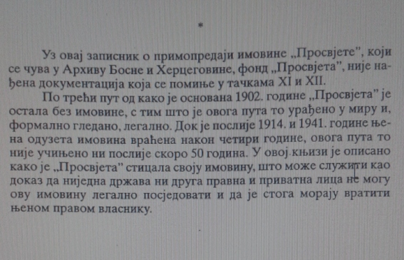 – Na prvom mjestu je spomen ploča koja je postavljena na obnovljenoj Vijećnici, zdanju koje je ponos svih građana Sarajeva, a na kojoj stoji „Na ovom su mjestu srpski zločinci u noći 25/26. 08. 1992. zapalili Nacionalnu i univerzitetsku bibilioteku Bosne i Hercegovine. U plamenu je nestalo više od 2 miliona knjiga, časopisa dokumenata. Ne zaboravite, pamtite i opominjite“. Nadamo se da nije postojala svjesna namjera u koncepciji ovakvog natpisa da se cijeli jedan konstitutivni narodsvede na nivo zločinca, što je utisak koji se neminovno nameće čitanjem.Srbi ovaj grad doživljavaјu kao svoj, i veliki je broj Srba koje njegove ratne rane bole jednako kao i sve ostale građane, ali još više boli formulacija na Vijećnici, koja cijeli jedan narod poistovjećuje sa zločincima. Koliko je puta potrebno ograditi se od zlodjela koja su počinjena od 1992. do 1995. godine da bi se napokon shvatilo da се ovakvi propusti ne smiju događati,ukoliko se želi graditi zajednički život? Apelujemo da se napravi primjereniji tekst kako svi oni koji su te avgustovske noći sa bolom gledali plamen na Vijećnici ne bi danas sa podjednakim bolom gledali tablu na obnovljenom zdanju, te očekujemo da će i SPKD Prosvjeta biti konsultovana prilikom prilagođavanja teksta na Vijećnici.