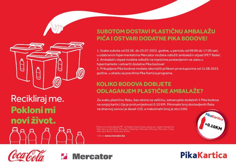 Coca-Cola poziva sve građane prikupe i dostave plastične boce u odabrane hipermarkete Mercator širom BiH i dobiju dodatne bodove na svojoj Mercator Pika kartici. Lokacije na kojima će građani moći donijeti plastične boce su: Mercator Ložionička, Mercator Dobrinja, Mercator Mostar, Mercator Tuzla, Mercator Borik, Mercator Brčko.