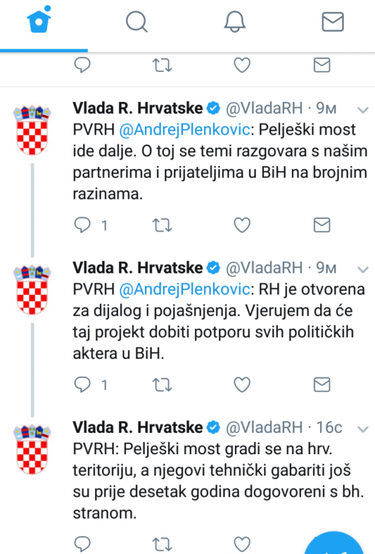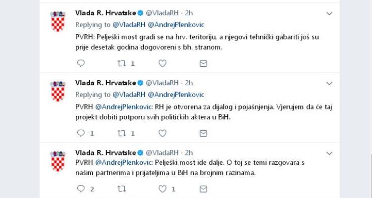 U prvom tvitu je saopšteno „Pelješki most ide dalje. O toj se temi razgovara s našim partnerima i prijateljima u BiH na brojnim razinama“. Odmah nakon toga uslijedio je tvit u kojem je pisalo „RH je otvorena za dijalog i pojašnjenja. Vjerujem da će taj projekt dobiti potporu svih političkih aktera u BiH“, a nepunih deset minuta nakon toga i treći – „Pelješki most gradi se na hrv. teritoriju, a njegovi tehnički gabariti još su prije desetak godina dogovoreni s bh. stranom“.