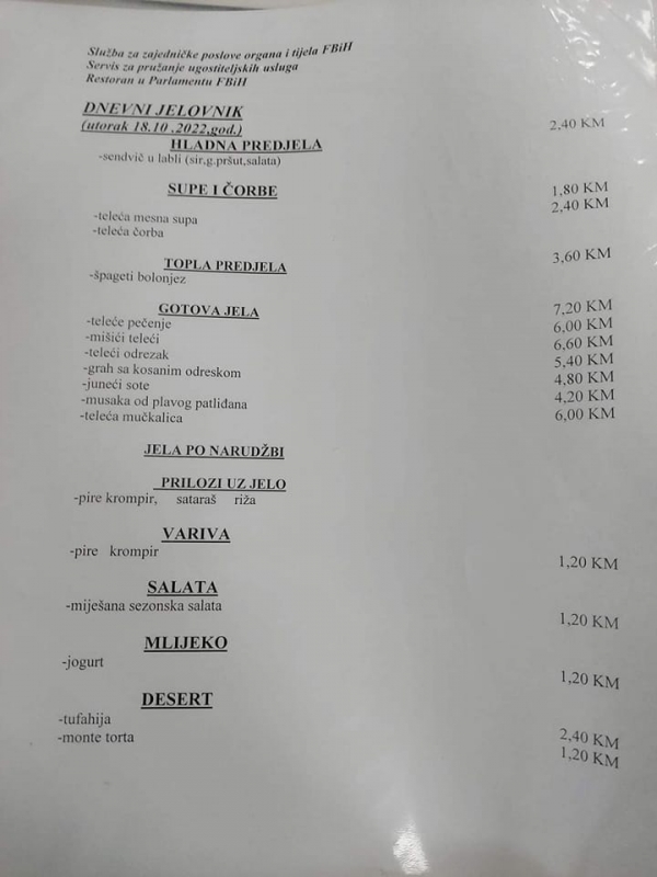 U fotografiji ispod pogledajte spisak cijena u restoranu Parlamenta FBiH: