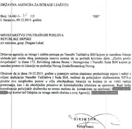 U depeši koju je SIPA uputila 9. decembra 2015. godine ministru unutrašnjih poslova RS Draganu Lukaču moli se da „MUP RS pruži neophodnu pomoć u cilju obezbjeđenja lokacija na kojima će se vršiti radnja pretresanja, kao i da se obezbijedi prisustvo tri kriminalistička tehničara sa opremom.“
