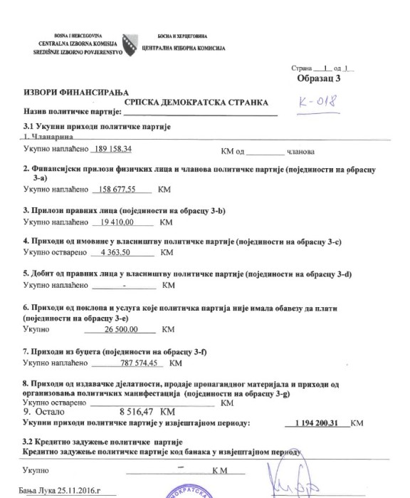 U finansijskom izvještaju dostavljenom Centralnoj izbornoj komisiji, SDS je naveo spisak prihoda i rashoda, a značajan dio budžeta u izvještajnom periodu, stranka je popunila donacijama fizičkih lica – ukupno blizu 160.000 konvertibilnih maraka.
