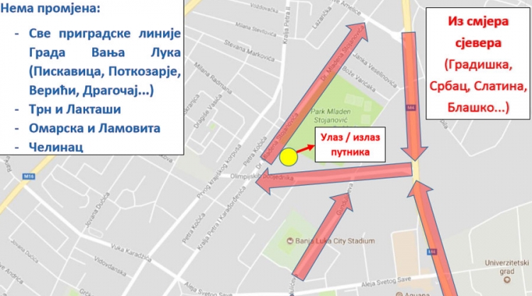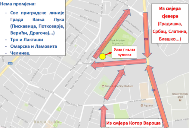 “Izmjene trasa se odnose na autobuse iz Gradiške, Srpca, Prijedora, Blaškog, Slatine i drugih republičkih linija, kojima će biti omogućeno da dođu do zgrade Administrativnog centra Vlade RS, odnosno do Ulice olimpijskih pobjednika i da se ulaz/izlaz putnika vrši na stajalištu kod PMF-a. Takođe, autobusima iz smjera Kotor Varoša će biti omogućeno da preko mosta Venecija i Gundulićeve ulice dođu do Ulice olimpijskih pobjednika, zatim ka zgradi Vlade RS te desno do terminala Malta”, rekli su iz Odjeljenja za saobraćaj i puteve.