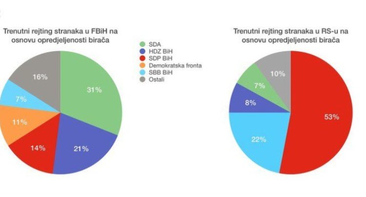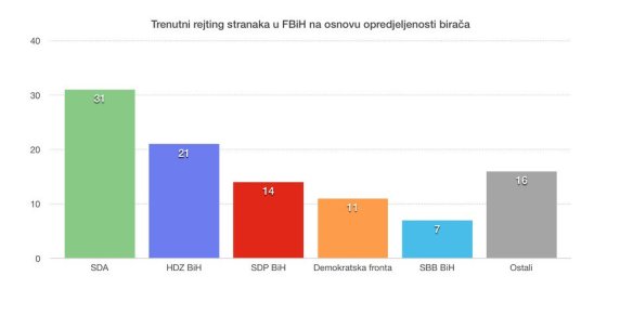 Rejting, odnosno raspored stranaka u Federaciji BiH među opredijeljenim glasačima (30 posto ispitanika u FBiH) je u odnosu na isti period prošle godine blago promijenjena, SDA je i dalje na prvom mjestu sa 31 posto podrške, a slijede HDZ s 21 posto, SDP 14 posto, Demokratska fronta 11 posto, SBB 7 posto itd.