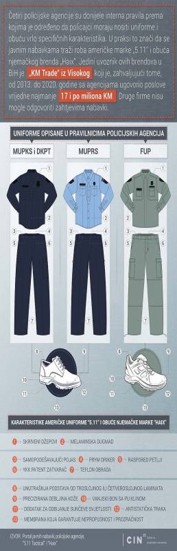 Četiri policijske agencije u Bosni i Hercegovini (BiH) su od firme “KM Trade” godinama kupovale uniforme i obuću, čija se vrijednost računa u milionima, vodeći se internim pravilnicima koji iz ovog posla isključuju druge domaće firme. Ovim dokumentima je određeno da policajci moraju nositi uniforme i obuću koje odgovaraju karakteristikama američke marke “5.11” i njemačke marke “Haix”. Jedini zastupnik robe takvih karakteristika, precizno opisanih u pravilnicima, je “KM Trade” iz Visokog.