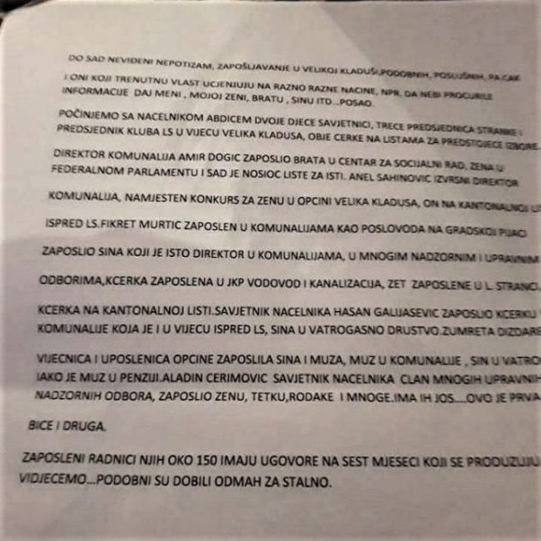 Opština Velika Kladuša nije specifična samo po migrantskoj krizi. Odlikuju je i nepotizam i korupcija o kojoj se u ovoj lokalnoj zajednici priča javno i otvoreno kao o nekoj normalnoj i svakodnevnoj pojavi za koju se, međutim, unazad godinama ne izriču sankcije. Za koju ne postoji ni bilo kakva osuda sa kantonalnog, federalnog ili državnog nivoa.