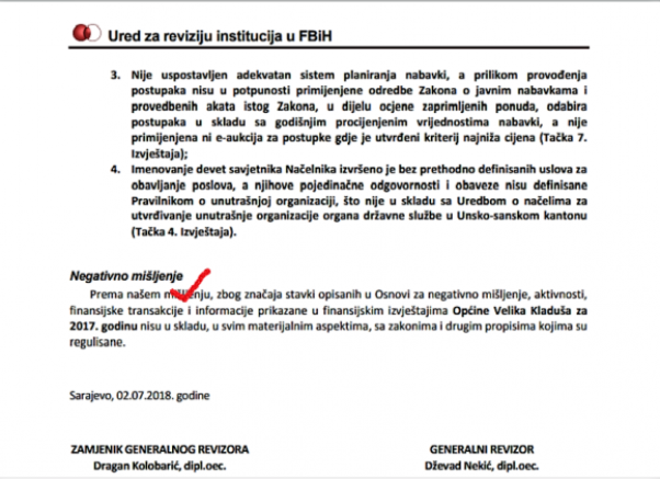Foto: Faksimil dijela izvještaja federalne revizije koja je poslovanje Općine Velika Kladuša za 2017. ocijenila negativnim mišljenjem