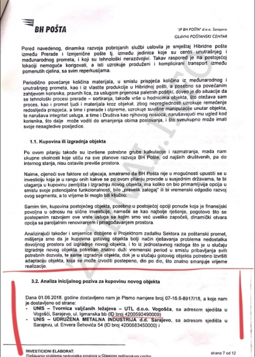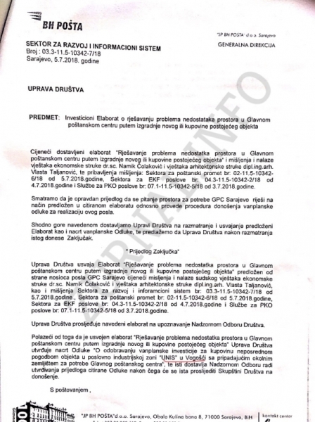 „Uprava Društva utvrđuje nacrt Odluke o odobravanju vanplanske investicije za kupovinu neposrednom pogodbom objekta u poslovno industrijskoj zoni „UNIS“ u Vogošći“, navedeno je u dokumentu BH Pošte zavedenim pod brojem protokola 03-3-11-5-10342-7/18, a koji je sačinjen 5. jula ove godine.