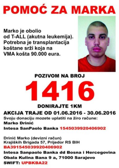 Pozivom na broj 1416 daruje se po jedna KM za pomoć liječenju Marka Drinića iz Prijedora, a humanitarni broj aktiviran je posredstvom Kola srpskih sestara Prijedor i kompanije “M:tel”.