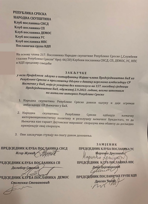 Ovi zaključci donijeti su u vezi sa prijedlogom odluke o potvrđivanju izjave člana Predsjedništva BiH iz Republike Srpske o proglašenju odluke o davanju agremana njemačkom ambasadoru, koja je usvojena bez konsenzusa na posebnoj sjednici Predsjedništva BiH održanoj 2. septembra ove godine veoma štetnom po vitalne interese Republike Srpske.