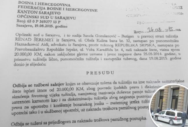 Međutim, u presudi u čijem posjedu je naš list precizno se navodi da se "odbija tužbeni zahtjev za naknadu nematerijalne štete u visini od 20.000 KM zbog povrede ljudskih prava i diskriminacije tužioca Renada Šeremeta, skraćenje njegovog životnog vijeka i izazivanje duševne patnje".