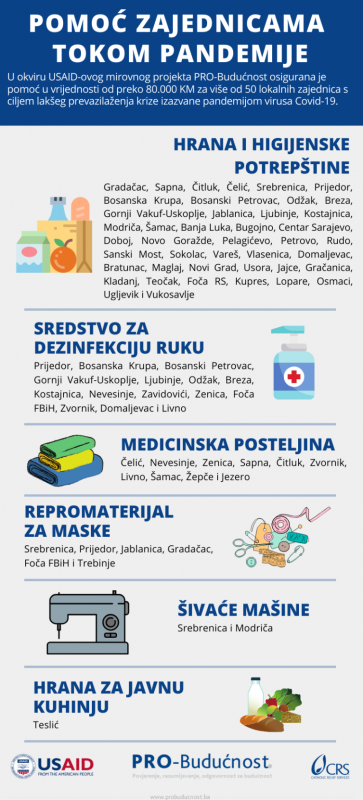 PRO-Budućnost je projekat Američke agencije za međunarodni razvoj (USAID) za izgradnju mira i povjerenja među građanima koji provodi organizacija Catholic Relief Services (CRS) sa partnerima u 75 lokalnih zajednica. Nastojeći pružiti podršku kada je najpotrebnija, dio sredstava ovog projekta preusmjeren je za pomoć koja je pripremljena u dogovoru sa predstavnicima lokalnih zajednica.