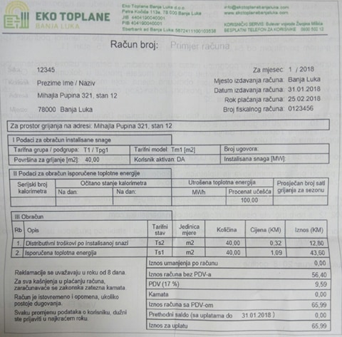 Na poleđini probnog računa stoji i obavještenje za korisnike da obaveze za grijanje zaključno sa 31. januarom ostaju prema staroj banjalučkoj „Toplani“, a sve obaveze od 1. februara idu ka „Eko toplanama“.