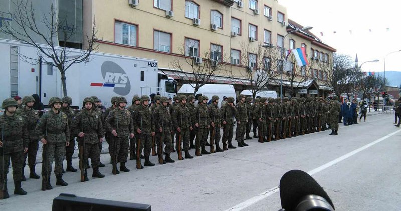 Ispred Trga Krajine postrojeni su pripadnici Trećeg pješadijskog Republika Srpska puka.