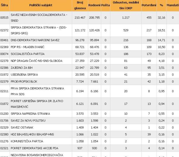 SDS je osvojio 121.172 glasova ili 18,51 odsto, DNS 96.278 ili 14,71 odsto, PDP 68.721 ili 10,50 odsto, SP 53.837 ili 8,23 odsto, NDP 27.359 ili 4,18 odsto, Zajedno za BiH 22.947 ili 3,51 odsto i Ujedinjena Srpska 20.595 ili 3,15 odsto.