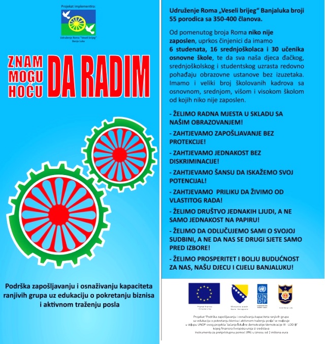 Projekat Udruženja Roma "Veseli brijeg" Banjaluka pod nazivom "Podrška zapošljavanju i osnaživanju kapaciteta ranjivih grupa uz edukaciju o pokretanju biznisa i aktivnom traženju posla" traje 8 mjeseci, od septembra 2013. do aprila 2014. godine.