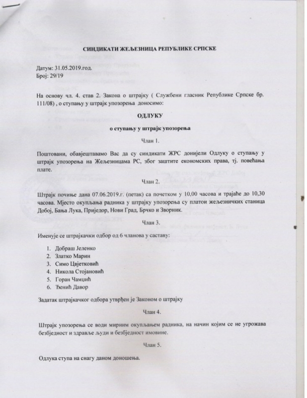 Marin je rekao da je ta odluka donesena na današnjem sastanku sindikata ŽRS, jer nisu povećane plate u ovom preduzeću.
