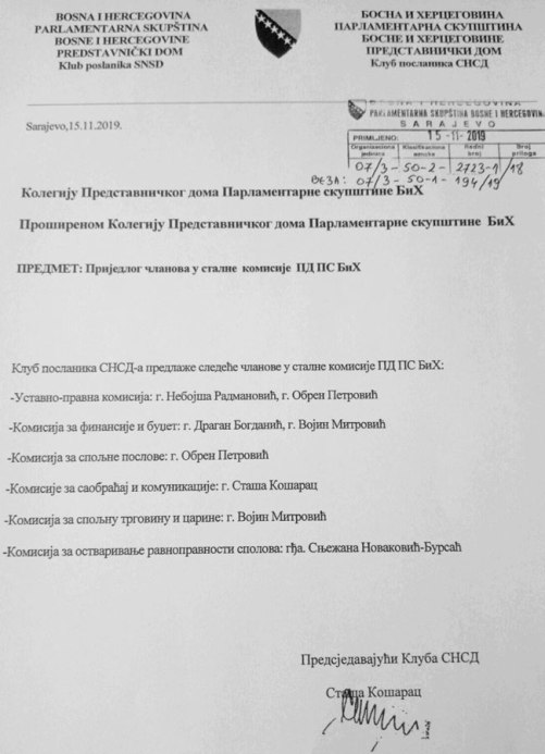 Naglasio je da SNSD to nikada neće dopustiti i to je ključni razlog zbog kojeg su dostavili prijedlog članova u stalnim komisijama Predstavničkog doma parlamenta BiH.