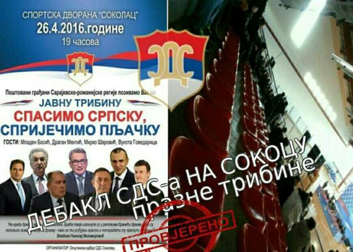 Montirana fotografija naslovljena je kao „Propala tribina SDS-a" a donosi još i natpis „Debakl SDS-a, na Sokocu prazne tribine" sa improvizovanim pečatom na kome piše „provjereno".