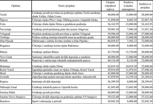 Opštine u kojima će se sprovoditi projekti su: Teslić, Šipovo, Foča, Nevesinje, Višegrad, Trebinje, Han Pijesak, Rogatica, Bileća, Novi Grad, Ribnik, Bratunac, Kotor Varoš, Brod, Zvornik, Kupres, Mrkonjić Grad, Istočna Ilidža, Istočno Novo Sarajevo, Kneževo, Istočni Drvar, Kozarska Dubica, Kalinovik, Novo Goražde i Srbac. Opštine sufinansiraju realizaciju projekata sa dodatnih 278.000 KM.