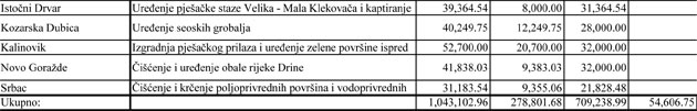 Na sprovođenju javnih radova predviđenih ovim projektima (uređenje javnih površina, saniranje divljih deponija, uređenje lokalnih puteva i riječnih korita i slično) privremeno će biti angažovano oko 600 nezaposlenih lica iz najugroženije kategorije stanovništva koji su identifikovani sa lokalnih biroa za zapošljavanja. Vremenski okvir za realizaciju projekata je 30 – 120 dana, u zavisnosti od obima radova.