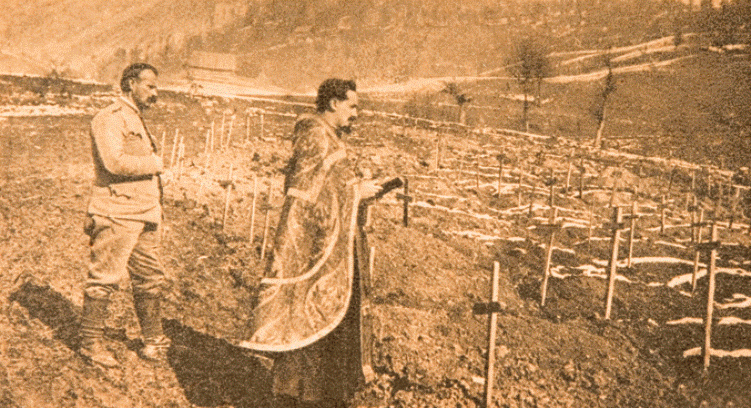 Насловна фотографија: Војни свештеник и фотограф Ристо Шуковић држи опело војницима умрлим од пегавог тифуса у Вардишту
